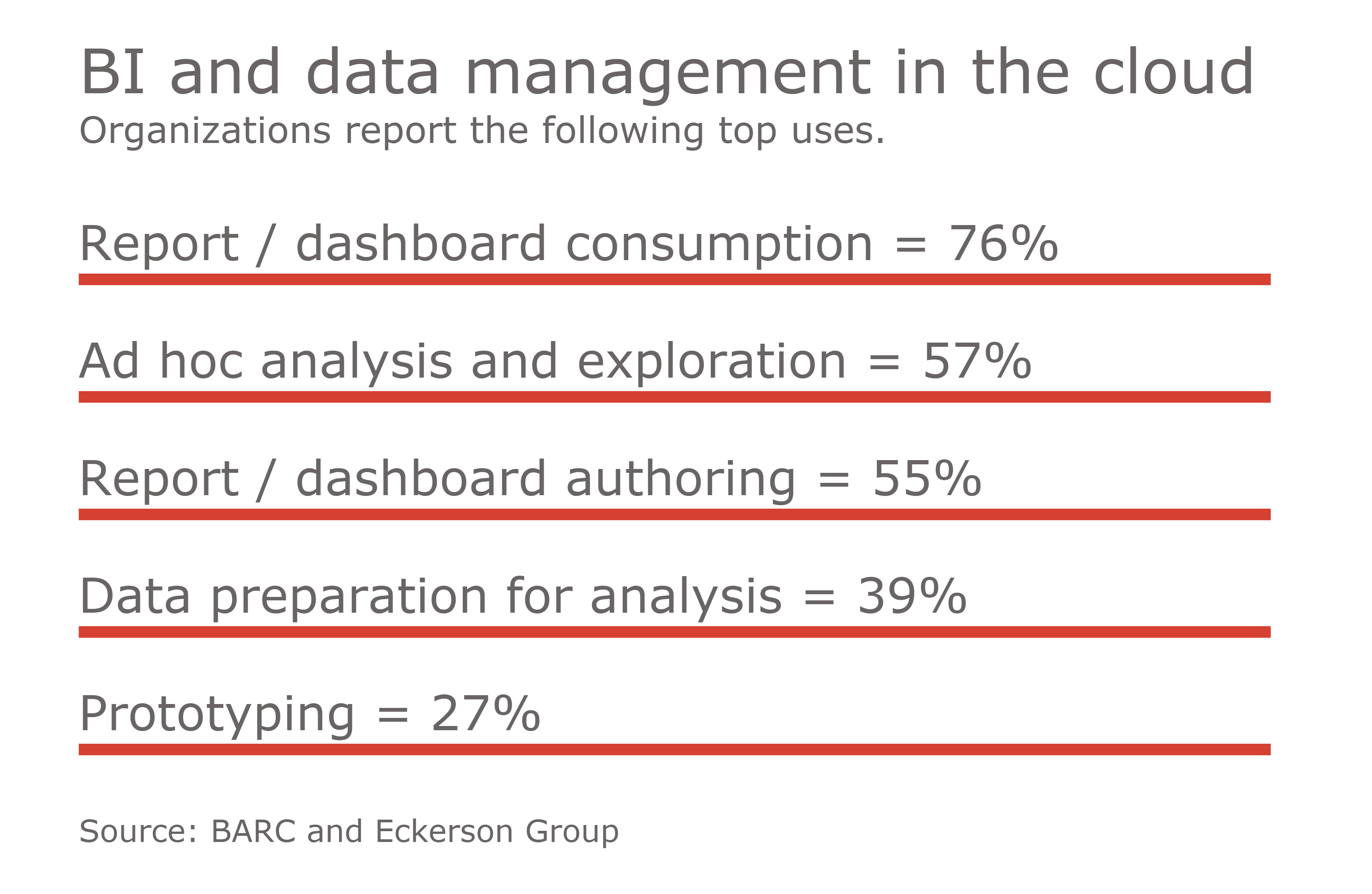 The top reason that organizations use the cloud with their BI and data management efforts is to deliver reports and dashboards (cited by 76 percent). But more than half also use the cloud to perform ad hoc analysis (57 percent) and author reports (55 percent). Next is data preparation for analysis (cited by 39 percent).